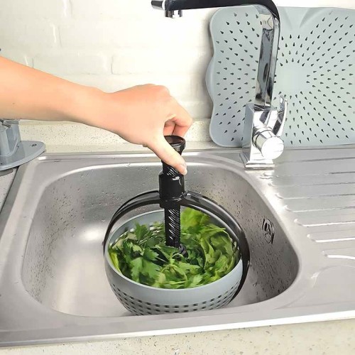 Express Salata Kurutucu Süzgeç, dönmeyi gerçekleştiren ve katlanarak saklamayı kolaylaştıran tutacağa sahiptir.Tutacak yukarı yönde kaldırılır ve salata kurutucu süzgeç lavaboya yerleştirilir. Tepe noktadan aşağı ve yukarı yönde kuvvet uygulanarak süzme ve kurutma işlemi gerçekleştirilir.
