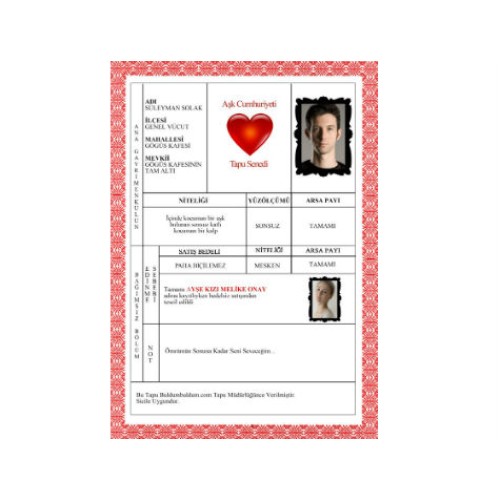 Aşk Tapusundaki sağ en üstteki resim yerine kalbinizi verdiğiniz sevgilinizin resmini ekleyerek sevgilinize tapusunu teslim edebilirsiniz.