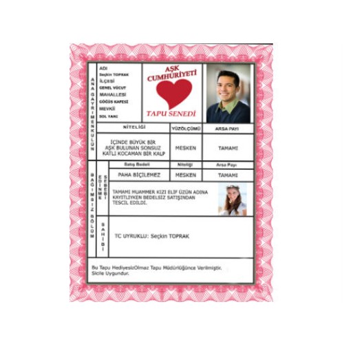 Üstelik Aşk Tapusu nun üzerindeki tüm gerekli boşlukları istediğiniz şekilde doldurabilirsiniz. Kendinizin ve sevgilinizin fotoğraflarını ekleyerek Aşk Tapunuzu eşsiz hale getirebilirsiniz