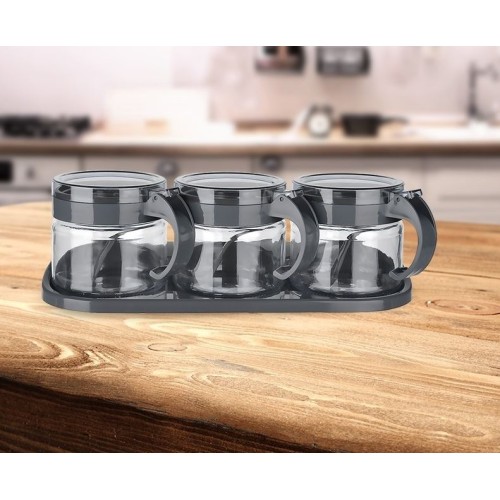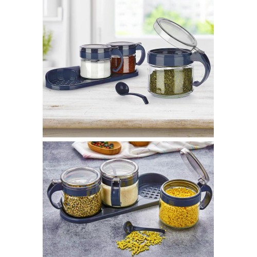 1 Adet 3lü kapaklı cam baharatlık, 3 adet plastik baharat kaşığı, 1 adet baharatlık standı