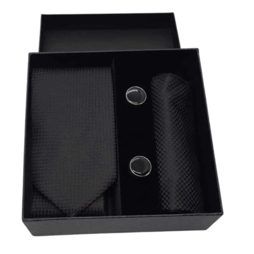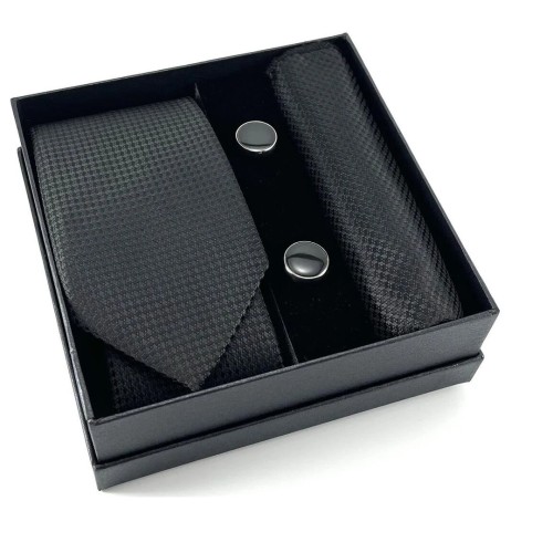 Kravat Düğme Set Siyah Desenli Kravat Mendil Kol Düğmesi Özel Set