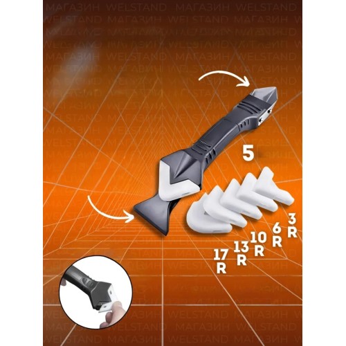 DEĞİŞTİRİLEBİLİR SİLİKON PEDLER: Farklı boyut ve yarıçapa sahip 5 adet değiştirilebilir silikon kafa ile birlikte gelir. Harç aleti kaymaz bir tasarıma sahiptir. Silikon sökücü aracı mutfak, duş, küvet, fayans, kapı, pencere, lavabo, derz dolgu bitirme ve daha fazlasında kullanılabilir. 3R, 6R, 10R, 13R ve 17R dahil olmak üzere farklı yarıçaplı kapaklara sahip 5 değiştirilebilir ped ile birlikte gelen Kaymaz sap ile tasarlanmıştır