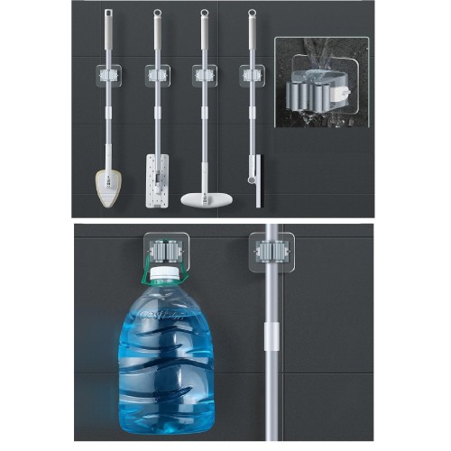 Süpürge, paspas, temizleme fırçası, şemsiye ve saplı diğer ürünleri asmak için kullanılabilir.