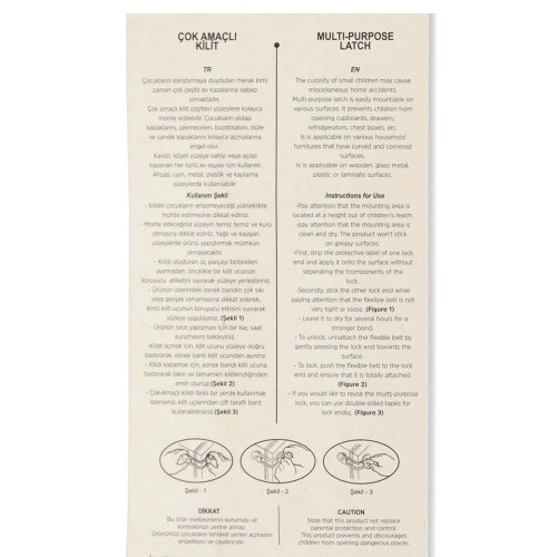 Evdeki dolap, buzdolabı, çamaşır makinesi gibi eşyalara yapıştırarak çocuklarınız için daha güvenli ve kazasız bir ortam sağlayabilmeniz mümkün.